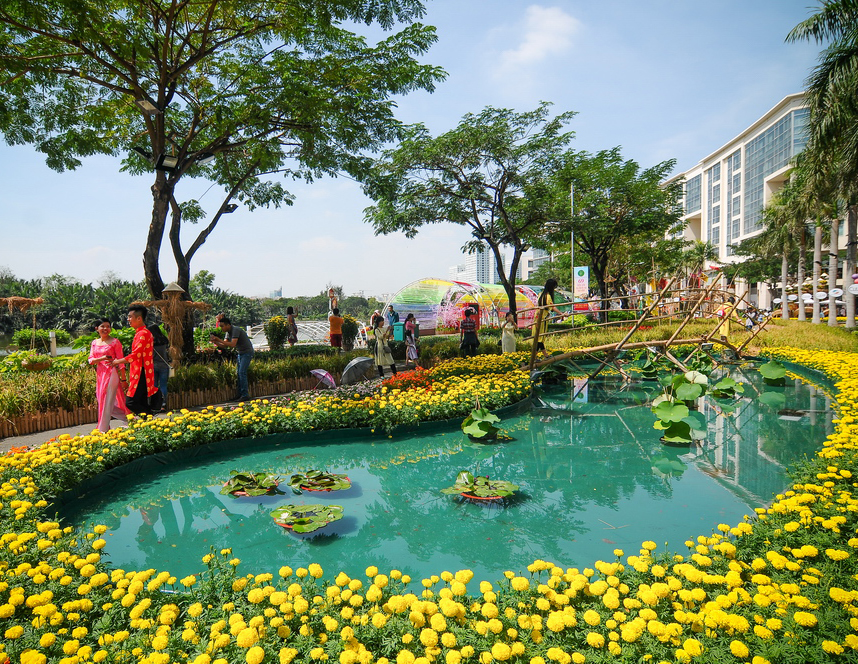 市内南のフーミーフン(Phu My Hung)地区で、毎年テトの時期に開催される花市場。始まりは2004年からと、比較的新しい。バングエット(Ban Nguyet)湖周辺の空き地や大通り沿いに広がり、約140のブースが並ぶ。ベンチェー(Ben Tre)省、ドンタップ(Dong Thap)省など各地の園芸農家から運ばれた花が販売され、価格も数百万VNDから数億VND相当まで幅広いニーズに応える。