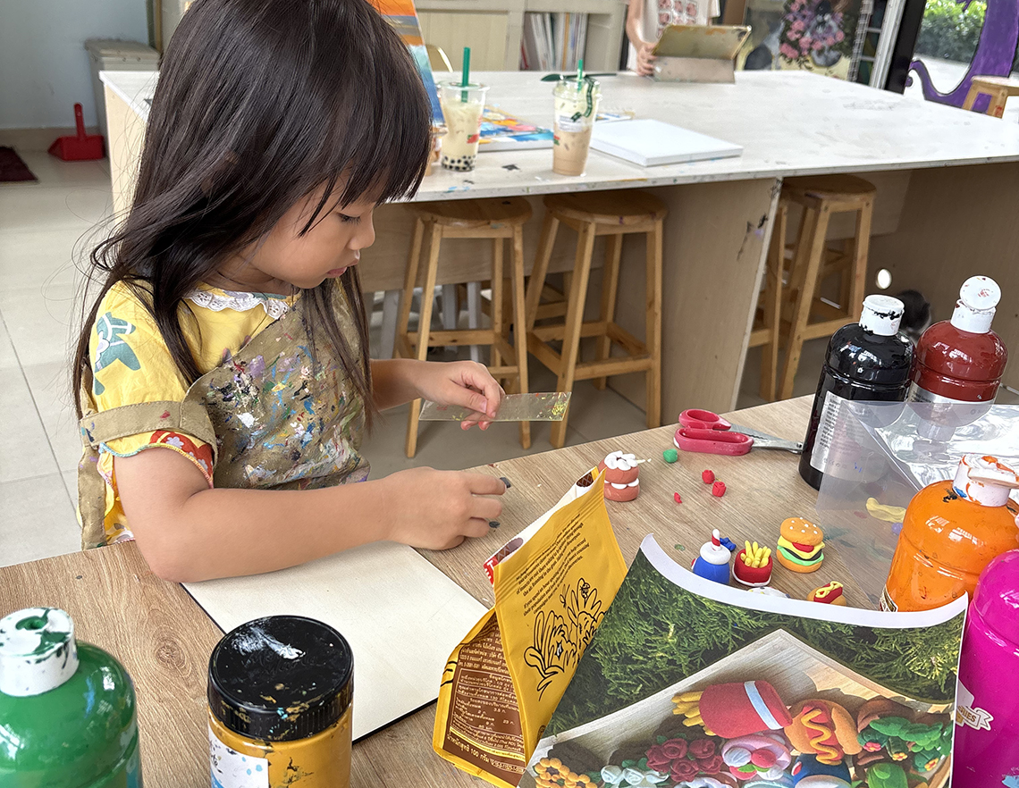 スタジオには、美術・建築大学卒業の英語対応可能なベトナム人教師が常駐。また、在籍生徒の中にはサイゴンサウスインターナショナルスクール(SSIS)などに通う多国籍の生徒も多い。コースは、2歳半から受講でき、必要に応じて付き添いの保護者も参加可能。
