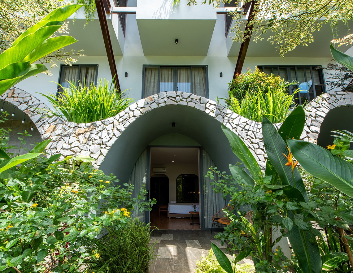 リゾートの中心には幅5mのプールが配置されている。プールサイドのバーでは、モクテルやフルーツサングリア(39万VND)を楽しめる。BBQメニューも人気で、屋外で炭火を囲み、和やかな時間を過ごせる。プール近くの広い庭には、緑や花々が丁寧に手入れされた小道が巡る。周囲に点在する数軒の民家を除けば、静かな環境が保たれている。