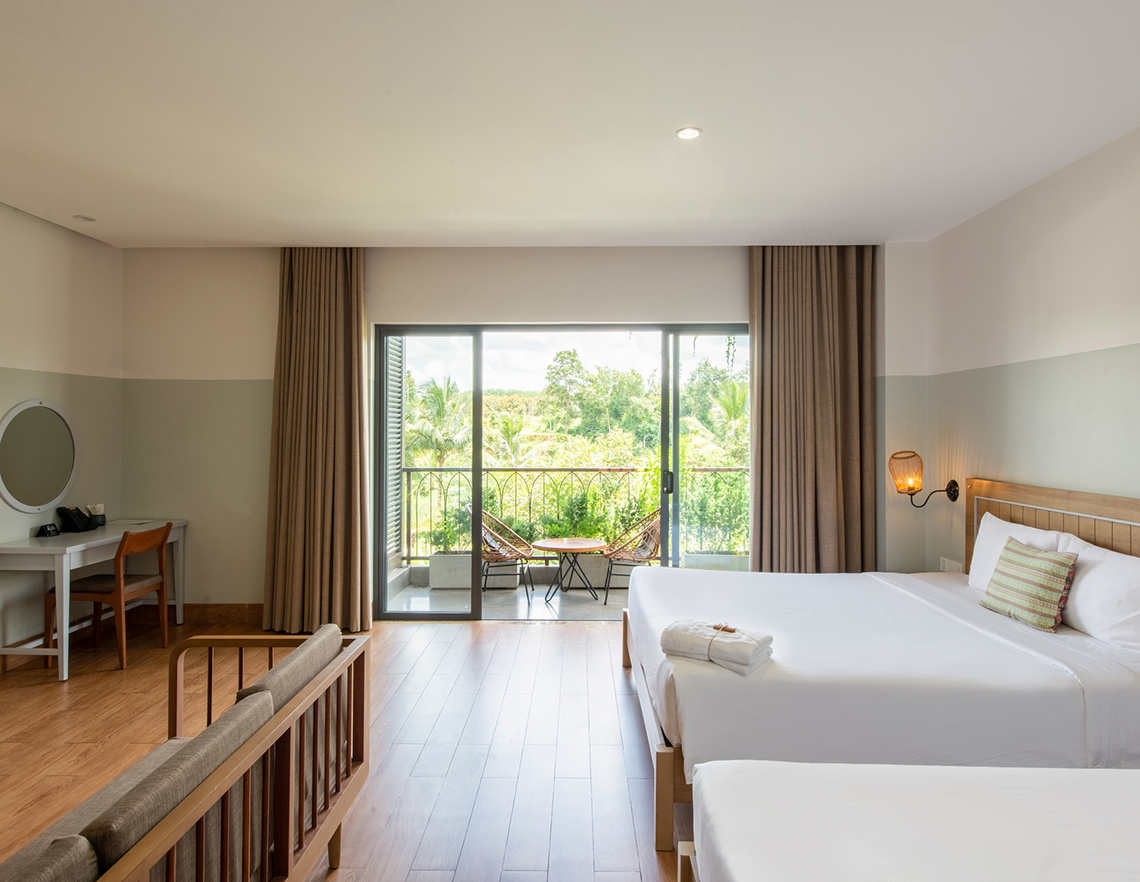 「バルコニーファミリールーム/Balcony Family」(48㎡、大人4名&5歳未満の子ども1名)は1泊205万VNDで、大きなベッドを2台備え、朝食やティータイムセットが付く
