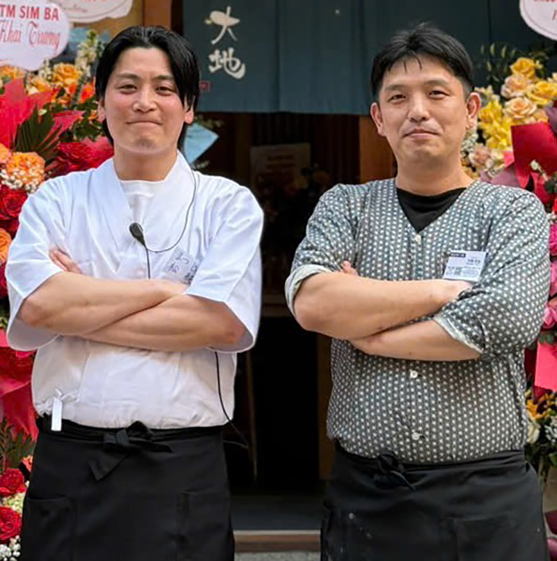 首都圏を中心に展開している、手打ち串のこだわり焼き鳥が一押しの居酒屋「寿司と焼き鳥大地」。リンラン(Linh Lang)地区にオープンしたベトナム1号店では、マネージャーの中林哲也さんがスタッフとともに自ら呼び込みの声を元気よく響かせている。