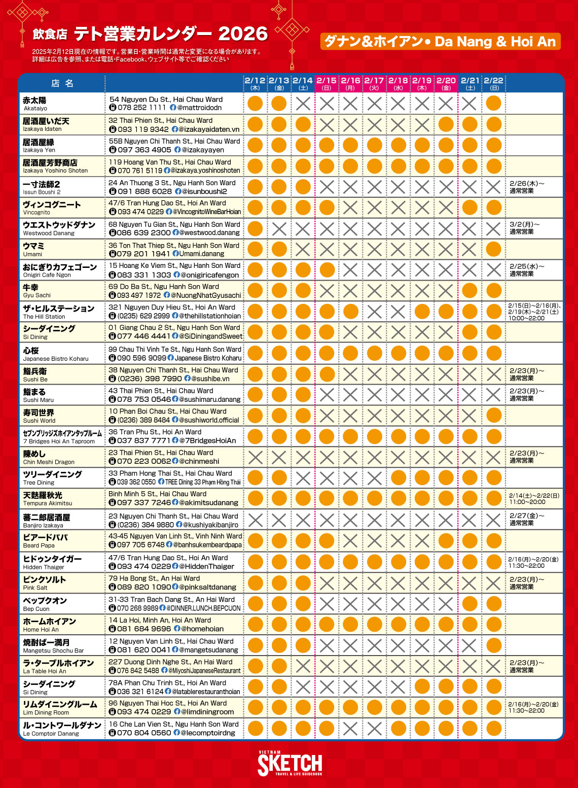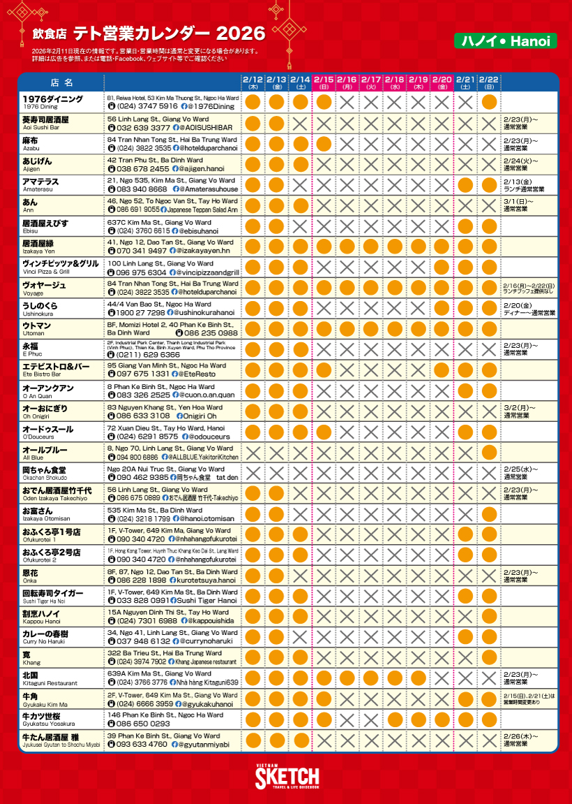 【飲食店】2026年テト休みカレンダー