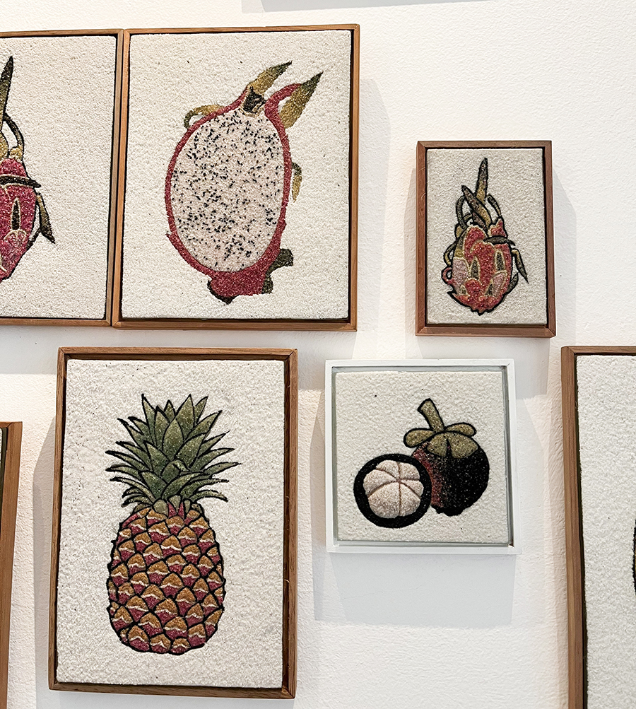 ベトナムの果物などを描いた、ベトナム産宝石の造形アートのラインナップ。100万VND~